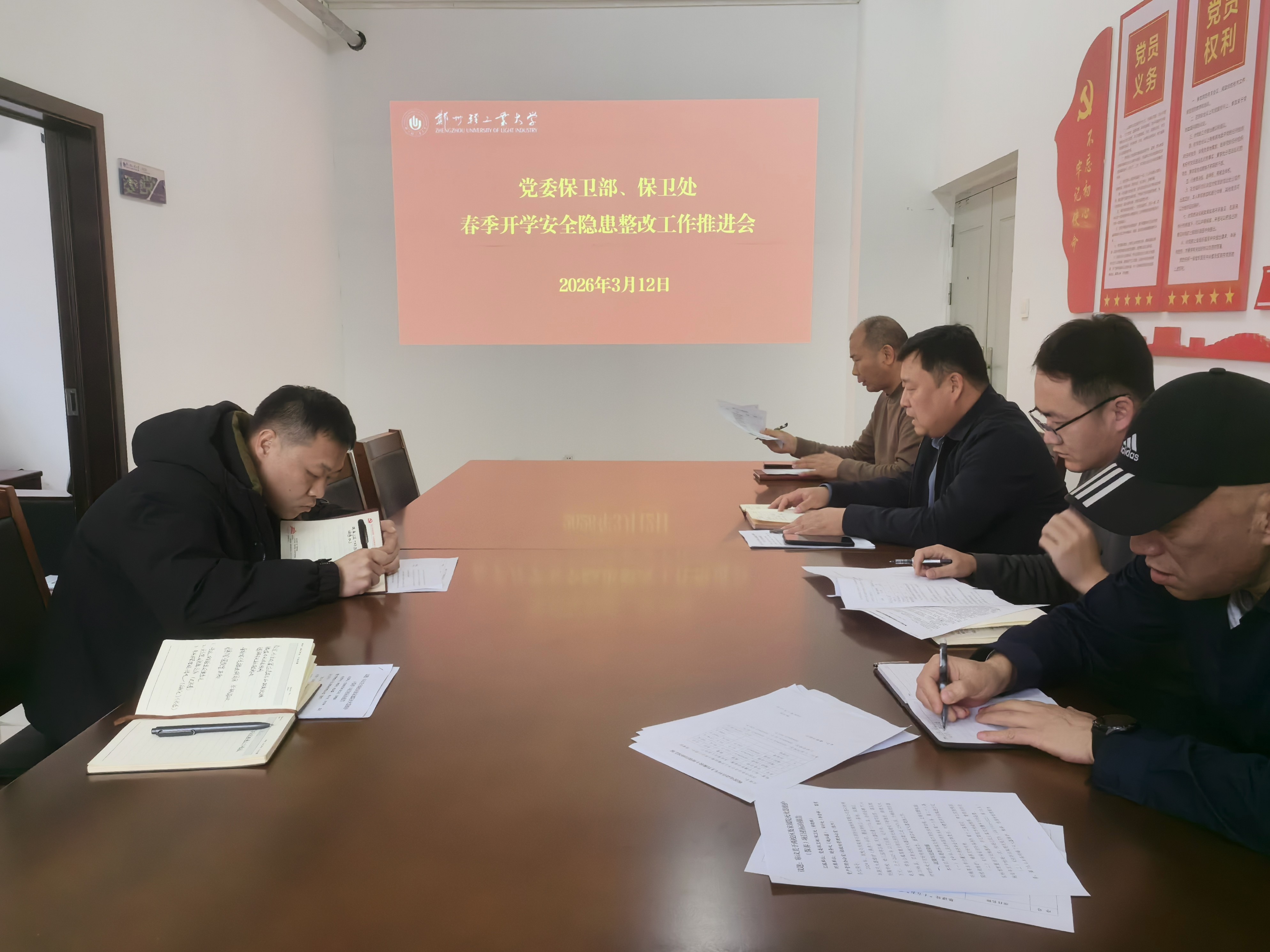 为深入落实省教育厅春季开学安全督导检查工作要求,扎实推进校园安全隐患排查整治,3月12日下午,党委保卫部、保卫处召开 2026 年春季开学安全隐患整改工作推进会。会议由党委保卫部部长、保卫处处长黄晓鹏主持,领导班子成员及相关科室负责人参会。